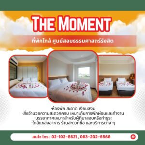 สำหรับผู้ที่เดินทางมาจากต่างจังหวัด หรือไม่ต้องการตื่นเช้าเพื่อเดินทางไกลในวันสอบ การเลือกพักใกล้สนามสอบเป็นอีกหนึ่งทางเลือกที่ช่วยให้คุณเตรียมตัวได้อย่างเต็มที่ แนะนำที่พัก The Moment Hotel ที่พักทำเลดี อยู่ใกล้ มหาวิทยาลัยธรรมศาสตร์ ศูนย์รังสิต ห้องพักสะอาด เงียบสงบ เหมาะกับการพักผ่อน สิ่งอำนวยความสะดวกครบ เดินทางสะดวกไปสนามสอบ การพักใกล้สนามสอบจะช่วยลดความเครียดจากการเดินทาง และทำให้คุณพร้อมที่สุดในวันสำคัญ