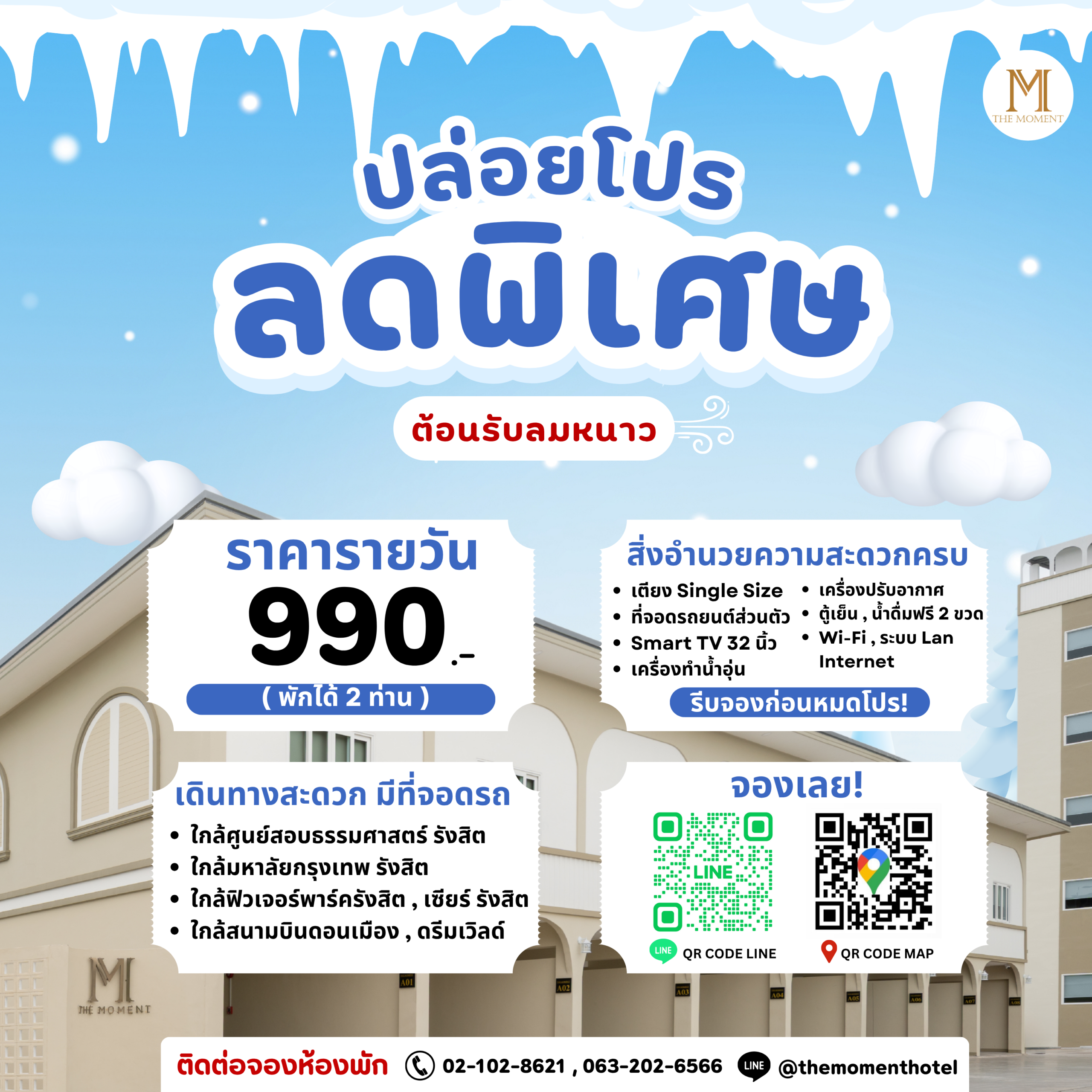 เข้าสู่ช่วงปลายปีแบบนี้ หลายคนมีแพลนเดินทางมาธรรมศาสตร์รังสิต ทั้งมาสอบ มาทำธุระ มาร่วมกิจกรรม หรือมาเยี่ยมนักศึกษาในช่วงไฮซีซั่นของรังสิต—แต่บอกเลยว่า ไม่ต้องกังวลเรื่องที่พัก เพราะ The Moment Hotel โรงแรมใกล้ม.ธรรมศาสตร์รังสิต จัดโปรพิเศษรับลมหนาว ให้ทุกคนเข้าพักได้ในราคาเบาๆ เริ่มต้นเพียง 990 บาทเท่านั้น! 🏨 The Moment โรงแรมใกล้มหาวิทยาลัยธรรมศาสตร์ รังสิต ที่ทั้งสะดวกและคุ้มค่า The Moment
