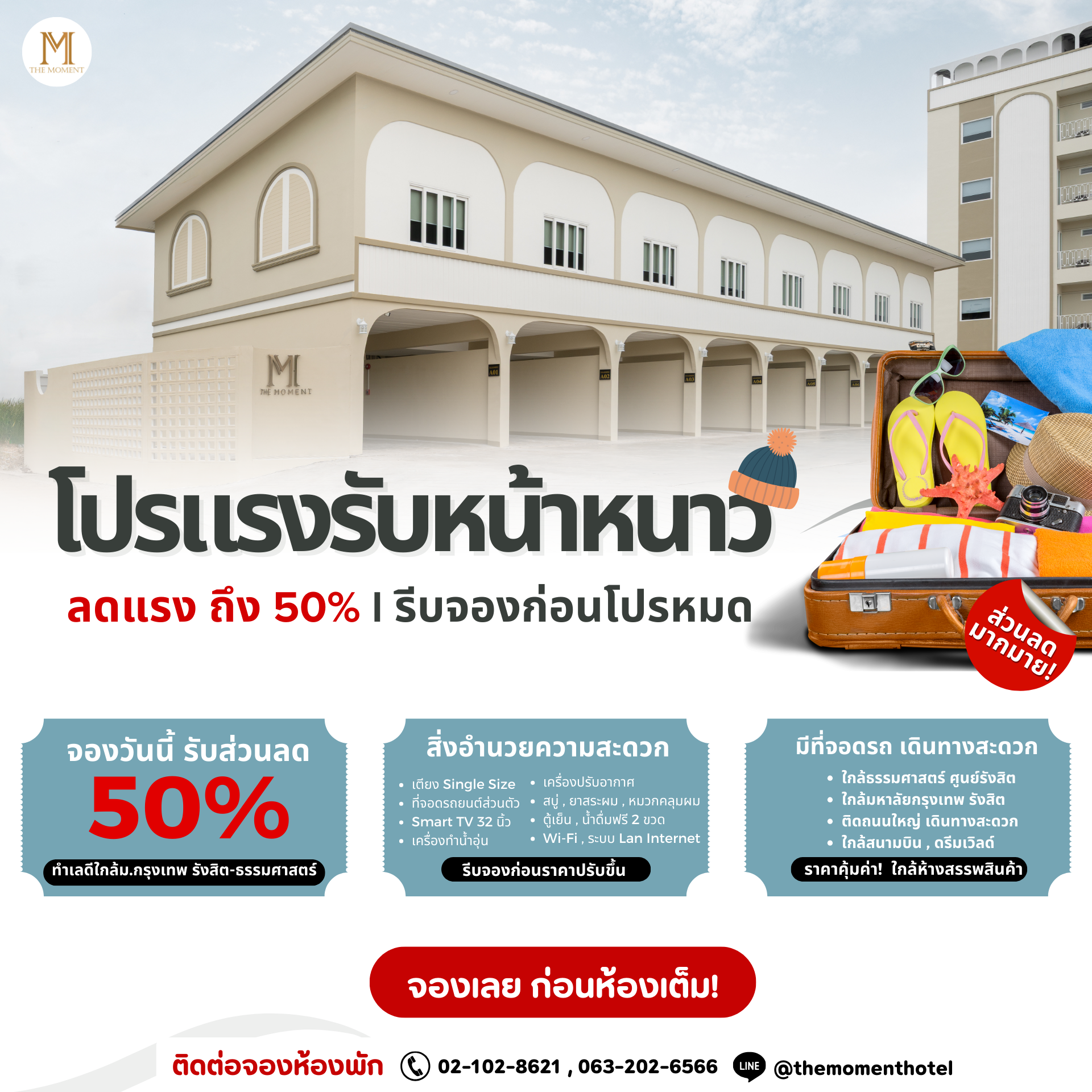 เข้าสู่ช่วงหน้าหนาวแบบนี้ ใครกำลังมองหา ที่พักบรรยากาศดี ราคาคุ้มค่า ต้องไม่พลาด The Moment Hotel ขอมอบโปรโมชันสุดพิเศษ ✨ลดแรงสูงสุดถึง 50% สำหรับผู้ที่จองล่วงหน้า รีบจองก่อนโปรหมด! The Moment ที่พักรายวันรังสิต ห้องพักใกล้ธรรมศาสตร์ โรงแรมใกล้มอกรุงเทพรังสิต โรงแรมใกล้ศูนย์สอบธรรมศาสตร์ เป็นที่พักดีไซน์เรียบหรู บรรยากาศเงียบสงบ เหมาะทั้งการพักผ่อนและการเดินทางเพื่อธุระต่าง ๆ ไม่ว่าจะมาเที่ยว มาสอบ