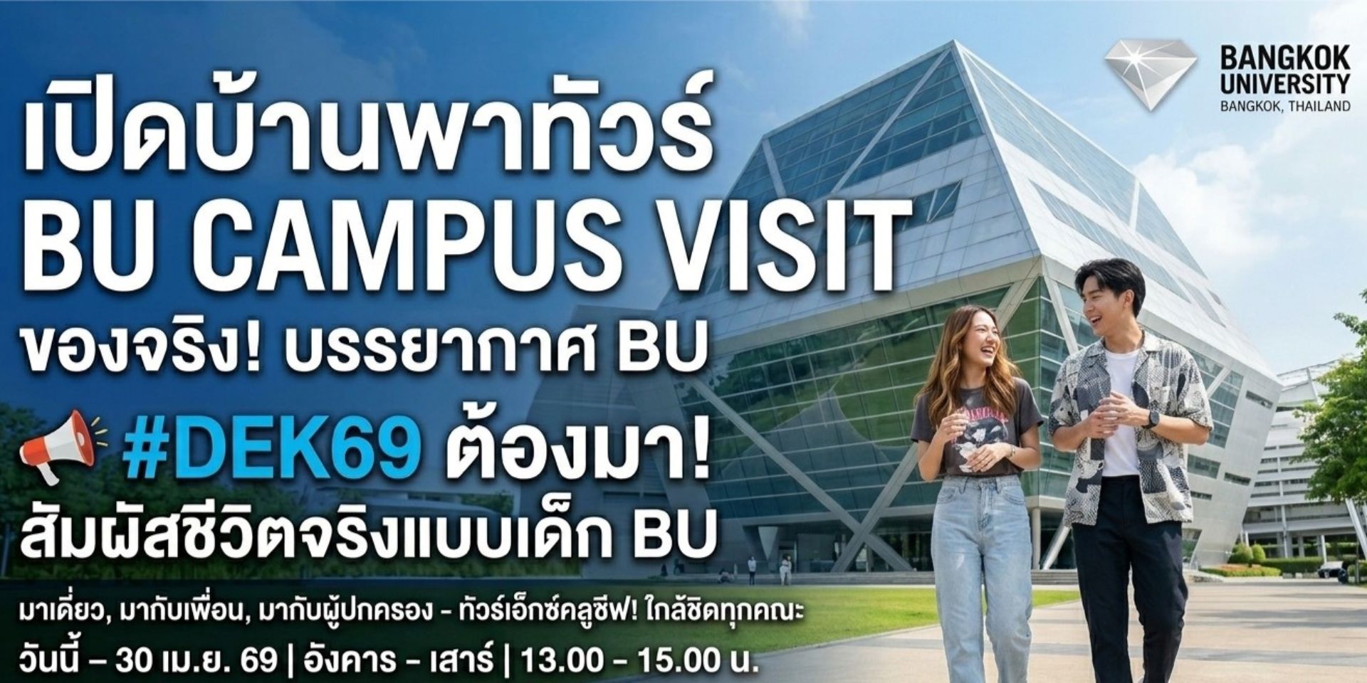 สำหรับน้อง ๆ ที่กำลังวางแผนเลือกมหาวิทยาลัย การได้ไปเห็นสถานที่จริงถือเป็นโมเมนต์สำคัญ เพราะบรรยากาศการเรียน สภาพแวดล้อม และชีวิตนักศึกษา ล้วนมีผลต่อการตัดสินใจ กิจกรรม BU Campus Visit ของ มหาวิทยาลัยกรุงเทพ จึงเป็นโอกาสดีที่น้อง ๆ จะได้เข้าไปสัมผัสประสบการณ์จริงในรั้วมหาวิทยาลัย ไม่ว่าจะมาเดี่ยว มากับเพื่อน หรือมากับผู้ปกครอง ก็สามารถเข้าร่วมทัวร์แบบใกล้ชิด พร้อมเปิดมุมมองใหม่เกี่ยวกับชีวิตมหาวิทยาลัยได้ครบในวันเดียว