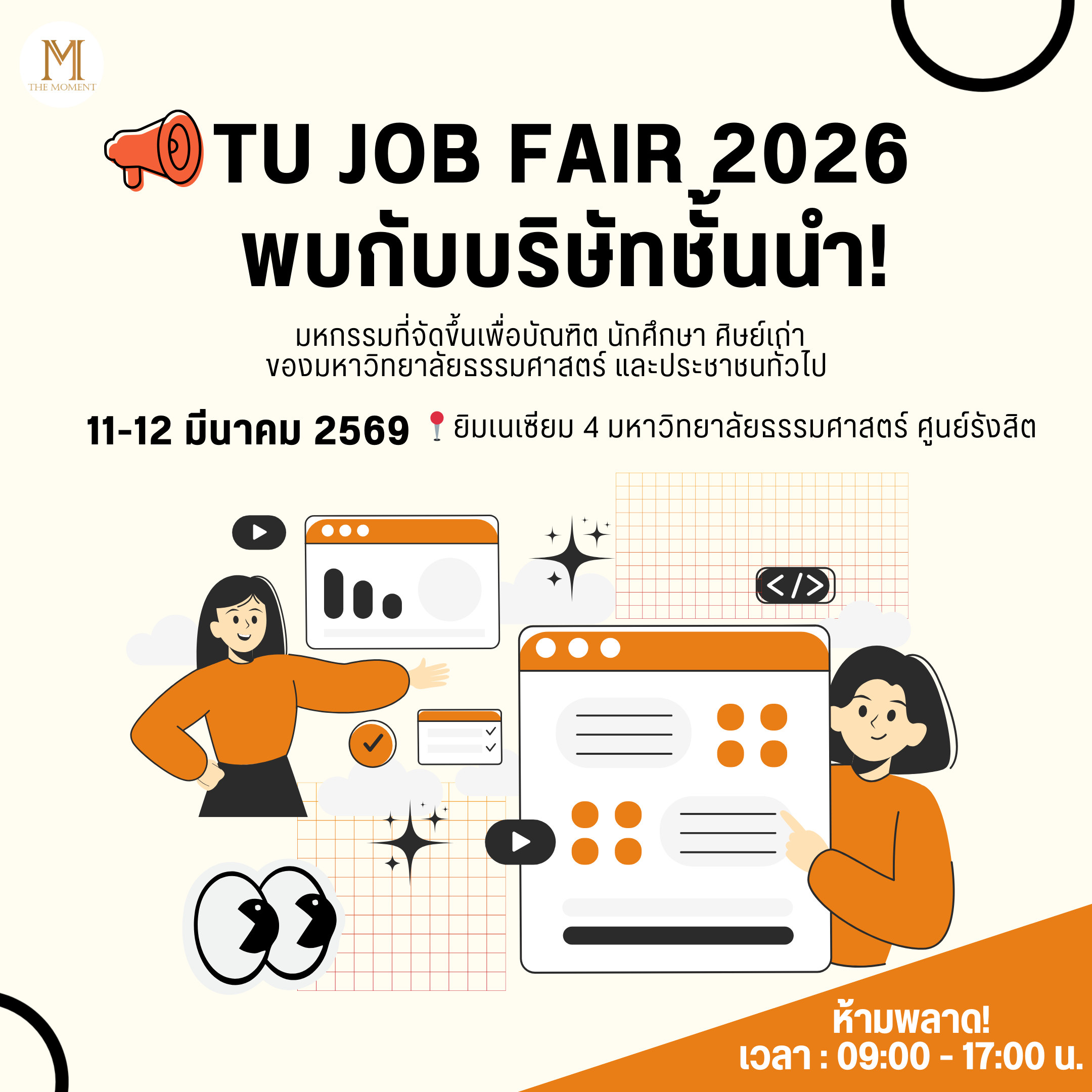 ห้ามพลาด! เตรียมตัวให้พร้อมกับ TU JOB FAIR 2026 งานมหกรรมสมัครงานครั้งใหญ่ ที่รวบรวมบริษัทชั้นนำมากกว่า 200 บริษัท มาเปิดโอกาสให้ผู้สมัครงานได้พบปะและสมัครงานโดยตรง งานนี้จัดขึ้นพื่อ นักศึกษา ศิษย์เก่า และประชาชนทั่วไป ที่กำลังมองหาโอกาสในการเริ่มต้นหรือพัฒนาเส้นทางอาชีพในอนาคต โดยภายในงานจะมีบูธจากองค์กรชั้นนำหลากหลายอุตสาหกรรม ทั้งภาครัฐและเอกชน พร้อมเปิดรับสมัครพนักงานในตำแหน่งต่าง ๆ มากมาย 📅 วันที่ 11 –