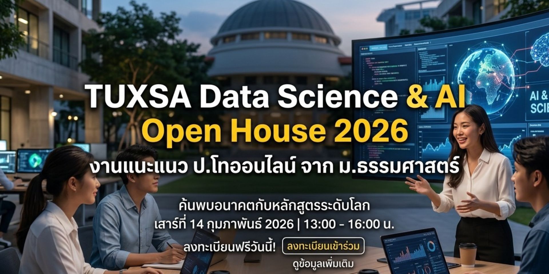 ในยุคที่โลกขับเคลื่อนด้วย Data และ AI การพัฒนาทักษะด้านเทคโนโลยีจึงกลายเป็นสิ่งสำคัญสำหรับการทำงานในอนาคต คำถามสำคัญไม่ใช่แค่ “ควรเรียนไหม” แต่คือ ควรเรียนด้านไหนให้เหมาะกับตัวเองมากที่สุด มหาวิทยาลัยธรรมศาสตร์ ร่วมกับ SkillLane จึงจัดงาน TUXSA Data Science & AI Open House 2026 งานแนะแนวปริญญาโทออนไลน์ ที่จะพาผู้สนใจไปทำความรู้จักโลกของ Data Science และ AI พร้อมอัปเดตเทรนด์ ทักษะที่ตลาดต้องการ และรายละเอียดของหลักสูตรจากผู้เชี่ยวชาญตัวจริงในวงการ