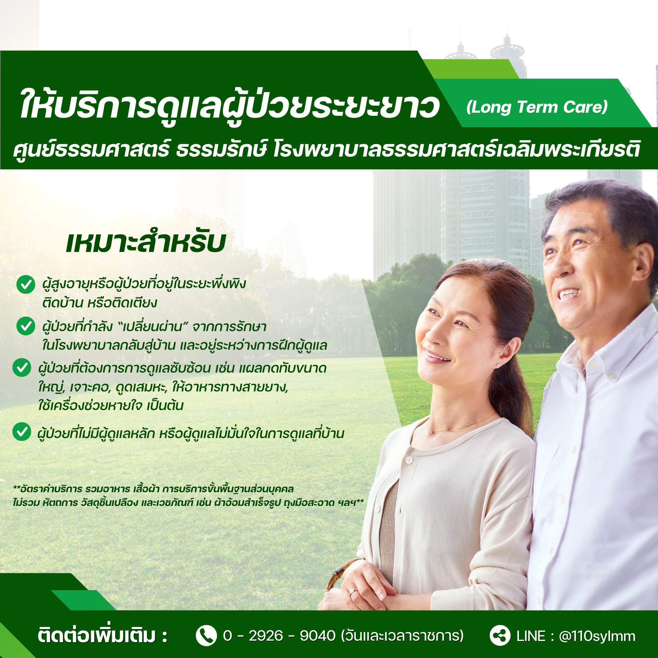 เมื่อคนที่คุณรักต้องการการดูแลอย่างต่อเนื่องและใกล้ชิด การเลือกสถานพยาบาลที่มีความพร้อมทั้งบุคลากรและระบบการดูแลคือสิ่งสำคัญ ศูนย์ธรรมศาสตร์ ธรรมรักษ์ โรงพยาบาลธรรมศาสตร์เฉลิมพระเกียรติ เปิดให้บริการดูแลผู้ป่วยระยะยาว (Long Term Care) เพื่อรองรับผู้สูงอายุและผู้ป่วยที่ต้องการการดูแลเป็นพิเศษ ด้วยความใส่ใจ อบอุ่น และมาตรฐานทางการแพทย์ 🩺 การดูแลผู้ป่วยดำเนินการโดย ทีมสหสาขาวิชาชีพ ที่มีความเชี่ยวชาญด้านผู้สูงอายุและผู้ป่วยติดเตียง ครอบคลุมทั้งด้านร่างกาย จิตใจ และคุณภาพชีวิต เพื่อให้ผู้ป่วยได้รับการดูแลอย่างเหมาะสมในทุกวัน 🌿 👉 ผู้ที่เหมาะสมเข้ารับบริการ ✅