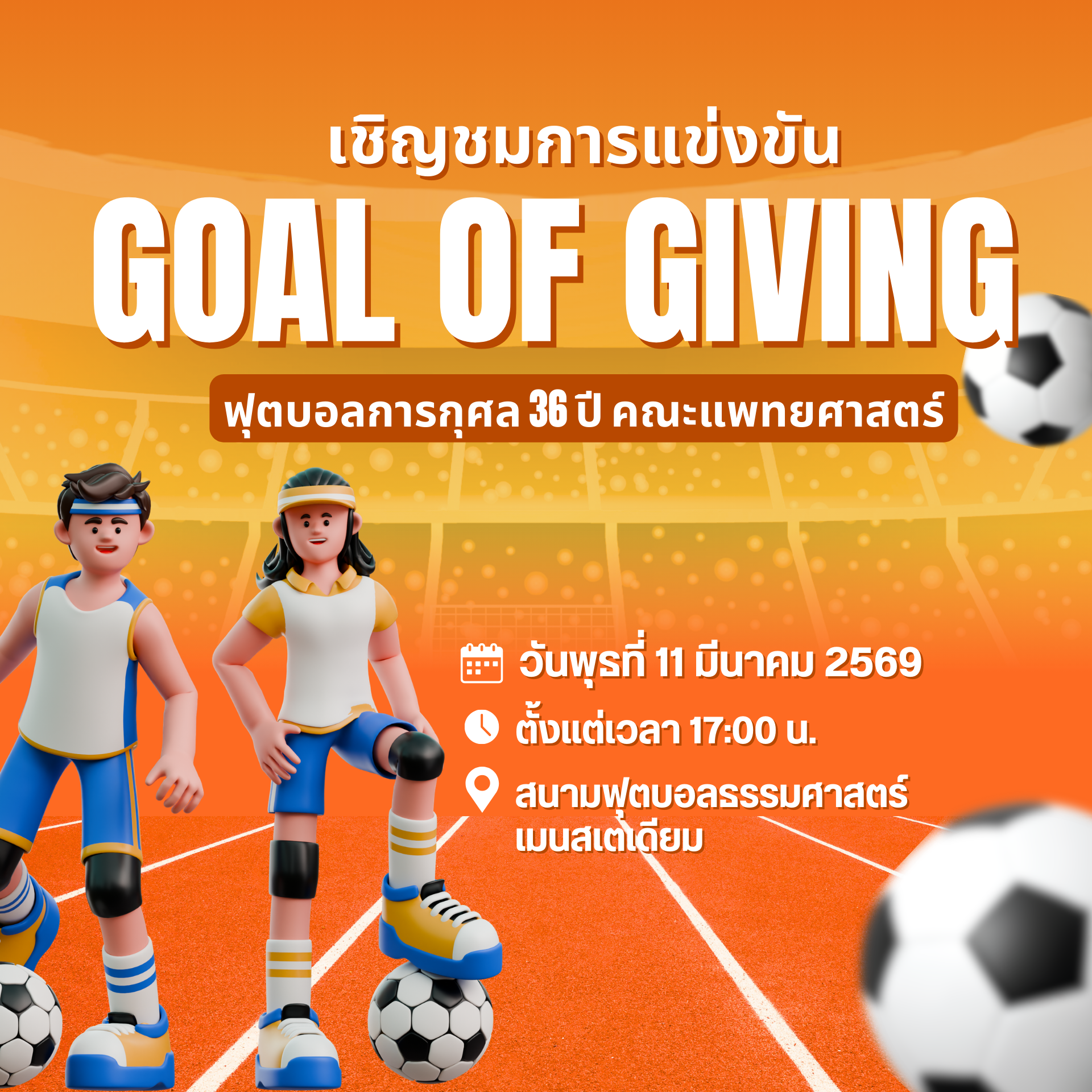อีกหนึ่งกิจกรรมดี ๆ ที่ไม่ควรพลาดสำหรับสายกีฬาและผู้ที่อยากร่วมทำบุญไปพร้อมกัน กับงานแข่งขันฟุตบอลการกุศล “GOAL OF GIVING” ซึ่งจัดขึ้นในโอกาสครบรอบ 36 ปี คณะแพทยศาสตร์ มหาวิทยาลัยธรรมศาสตร์ การแข่งขันครั้งนี้เป็นแมตช์พิเศษที่รวมพลังแห่งกีฬา ความสนุก และการแบ่งปันไว้ในงานเดียว โดยจะมีการแข่งขันระหว่าง ทีมแพทย์ธรรมศาสตร์ และ ทีม Singha All-Star ที่จะมาร่วมสร้างสีสันและความตื่นเต้นให้กับแฟนบอลและผู้เข้าร่วมงานทุกคน ⚽✨ 📅 วันพุธที่