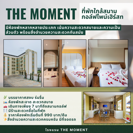 หากคุณกำลังมองหาที่พักใกล้สนามกอล์ฟในบรรยากาศสงบและสะดวกสบาย โรงแรม THE MOMENT ที่พักใกล้สนามกอล์ฟไพน์เฮิร์สท ห้องพักรายวันใกล้สนามกอล์ฟไพน์เฮิร์สท ที่พักหลักร้อยใกล้สนามกอล์ฟไพน์เฮิร์สท โรงแรมใกล้สนามกอล์ฟไพน์เฮิร์สท คือคำตอบที่ลงตัวที่สุด โรงแรมตั้งอยู่ใกล้สนามกอล์ฟไพน์เฮิร์สท คลองหลวง ปทุมธานี เดินทางเพียงไม่กี่นาทีก็ถึงสนามกอล์ฟมาตรฐานระดับมืออาชีพ เหมาะสำหรับทั้งนักกอล์ฟที่มาซ้อมหรือแข่งขัน รวมถึงผู้ที่ต้องการหาที่พักผ่อนในบรรยากาศร่มรื่น จึงเป็นตัวเลือกยอดนิยมสำหรับนักกอล์ฟและผู้ที่เดินทางมาพักผ่อนในย่านคลองหลวง ไม่ว่าจะมาทำกิจกรรม ซ้อมกอล์ฟ หรือหาที่พักผ่อนสบาย ๆ ก็สามารถตอบโจทย์ได้อย่างครบถ้วน