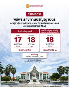 มหาวิทยาลัยธรรมศาสตร์ ศูนย์รังสิต เตรียมจัดพิธีพระราชทานปริญญาบัตร ประจำปีการศึกษา 2567 โดยได้รับพระมหากรุณาธิคุณจาก พระบาทสมเด็จพระวชิรเกล้าเจ้าอยู่หัว พร้อมด้วย สมเด็จพระนางเจ้าฯ พระบรมราชินี เสด็จพระราชดำเนิน เพื่อมอบปริญญาบัตรแก่ผู้สำเร็จการศึกษาทุกระดับอย่างสมเกียรติ