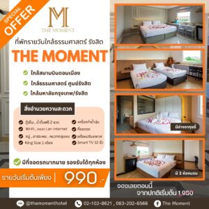 มาร่วมพิธีพระราชทานปริญญาบัตรต้องห้ามพลาดกับ ที่พักเปิดใหม่ราคานักศึกษา เดินทางง่ายใกล้ธรรมศาสตร์ ศูนย์รังสิต — The Moment สำหรับผู้ที่กำลังเข้าร่วมงานพิธีพระราชทานปริญญาบัตร หรือกิจกรรมต่าง ๆ ของมหาวิทยาลัยธรรมศาสตร์ ศูนย์รังสิต The Moment Hotel คือคำตอบของการพักผ่อนที่ลงตัว เดินทางสะดวก อยู่ใกล้มหาวิทยาลัยธรรมศาสตร์ ศูนย์รังสิต เพียงไม่กี่นาที บรรยากาศเงียบสงบ เหมาะสำหรับบัณฑิต ผู้ปกครอง และผู้เข้าร่วมงานทุกท่าน ห้องพักใหม่ สะอาด สไตล์โมเดิร์น มอบความเป็นส่วนตัวและความสบายตลอดการเข้าพัก เปิดให้บริการทั้งแบบรายวันและรายเดือน ในราคาเริ่มต้นเพียง 990 บาทต่อคืน ไม่ว่าคุณจะมาร่วม พิธีพระราชทานปริญญาบัตรมหาวิทยาลัยธรรมศาสตร์ ปีการศึกษา 2567 หรือต้องการที่พักสำหรับวันสำคัญอื่น ๆ ที่นี่คือจุดพักผ่อนที่ตอบโจทย์ที่สุดสำหรับใครที่กำลังมองหา โรงแรมใกล้มหาวิทยาลัยธรรมศาสตร์ ศูนย์รังสิต, ที่พักใกล้มหาวิทยาลัยธรรมศาสตร์ ศูนย์รังสิต, หรือ หาห้องพักใกล้มหาวิทยาลัยธรรมศาสตร์ ศูนย์รังสิต — เดินทางง่าย บรรยากาศดี และใกล้ทุกจุดหมายในย่านรังสิต
