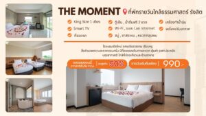 หากคุณกำลังมองหา ห้องพักใกล้ศูนย์สอบธรรมศาสตร์ หรือ ที่พักใกล้ศูนย์สอบธรรมศาสตร์ ที่สะดวกสบายและเดินทางง่าย The Moment คือคำตอบสำหรับคุณ! เรามีบริการ โรงแรมใกล้ศูนย์สอบธรรมศาสตร์ ที่ตอบโจทย์ทั้งนักเรียน นักศึกษา และผู้ปกครอง พร้อมบรรยากาศเงียบสงบเหมาะกับการพักผ่อนก่อนวันสอบ สำหรับผู้ที่ต้องการความประหยัด เรามีตัวเลือก ที่พักราคาถูกใกล้ศูนย์สอบธรรมศาสตร์ และ ที่พักหลักร้อยใกล้ศูนย์สอบธรรมศาสตร์ ที่คุ้มค่า พร้อมสิ่งอำนวยความสะดวกครบครันไม่ว่าจะเป็นครอบครัว หรือกลุ่มเพื่อนที่มาร่วมสอบ เราก็มี ที่พักสำหรับครอบครัวใกล้ศูนย์สอบธรรมศาสตร์ ที่กว้างขวาง และสะดวกสบาย นอกจากนี้ The Moment ยังตั้งอยู่ใกล้กับสถานที่สำคัญ เช่น ฟิวเจอร์พาร์ครังสิต และสวนสนุกยอดนิยม ทำให้คุณเดินทางได้สะดวกทุกจุดหมาย จองห้องพักกับเราวันนี้ เพื่อประสบการณ์ที่ดีและสะดวกสบายที่สุดในทุกการเดินทางใกล้ศูนย์สอบธรรมศาสตร์!