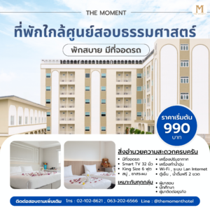 สำหรับผู้เข้าสอบและผู้ปกครองที่กำลังมองหา ห้องพักใกล้มหาวิทยาลัยธรรมศาสตร์ รังสิต โรงแรม The Moment ห้องพักรายวันใกล้ธรรมศาสตร์ รังสิต ที่พักรายวันศูนย์สอบธรรมศาสตร์ หาที่พักใกล้ศูนย์สอบธรรมศาสตร์ เป็นอีกหนึ่งตัวเลือกที่สะดวกสบายและเหมาะกับการพักก่อนวันสอบ โรงแรมตั้งอยู่ใกล้ศูนย์สอบ เดินทางง่าย ใช้เวลาไม่นานถึงมหาวิทยาลัยธรรมศาสตร์ รังสิต ทำให้สามารถวางแผนการเดินทางได้สะดวกและไม่ต้องกังวลเรื่องรถติดในวันสอบ