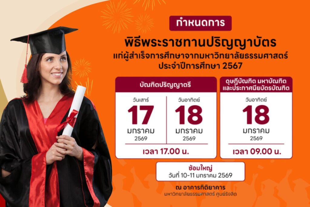พระบาทสมเด็จพระวชิรเกล้าเจ้าอยู่หัว เสด็จพระราชดำเนินในพิธีพระราชทานปริญญาบัตร มหาวิทยาลัยธรรมศาสตร์ ปีการศึกษา 2567 มหาวิทยาลัยธรรมศาสตร์ ศูนย์รังสิต เตรียมจัดพิธีพระราชทานปริญญาบัตร ประจำปีการศึกษา 2567 โดยได้รับพระมหากรุณาธิคุณจาก พระบาทสมเด็จพระวชิรเกล้าเจ้าอยู่หัว พร้อมด้วย สมเด็จพระนางเจ้าฯ พระบรมราชินี เสด็จพระราชดำเนิน เพื่อมอบปริญญาบัตรแก่ผู้สำเร็จการศึกษาทุกระดับอย่างสมเกียรติ 📅 กำหนดการสำคัญ บัณฑิตปริญญาตรี วันเสาร์ที่ 17 มกราคม 2569 วันอาทิตย์ที่ 18 มกราคม 2569 เวลา 17.00 น. ดุษฎีบัณฑิต, มหาบัณฑิต และประกาศนียบัตรบัณฑิต วันอาทิตย์ที่ 18 มกราคม 2569 เวลา 09.00 น. สถานที่จัดงาน: อาคารและบริเวณศูนย์รังสิต มหาวิทยาลัยธรรมศาสตร์ มาร่วมพิธีพระราชทานปริญญาบัตรต้องห้ามพลาดกับ ที่พักเปิดใหม่ราคานักศึกษา เดินทางง่ายใกล้ธรรมศาสตร์ ศูนย์รังสิต — The Moment สำหรับผู้ที่กำลังเข้าร่วมงานพิธีพระราชทานปริญญาบัตร หรือกิจกรรมต่าง […]
