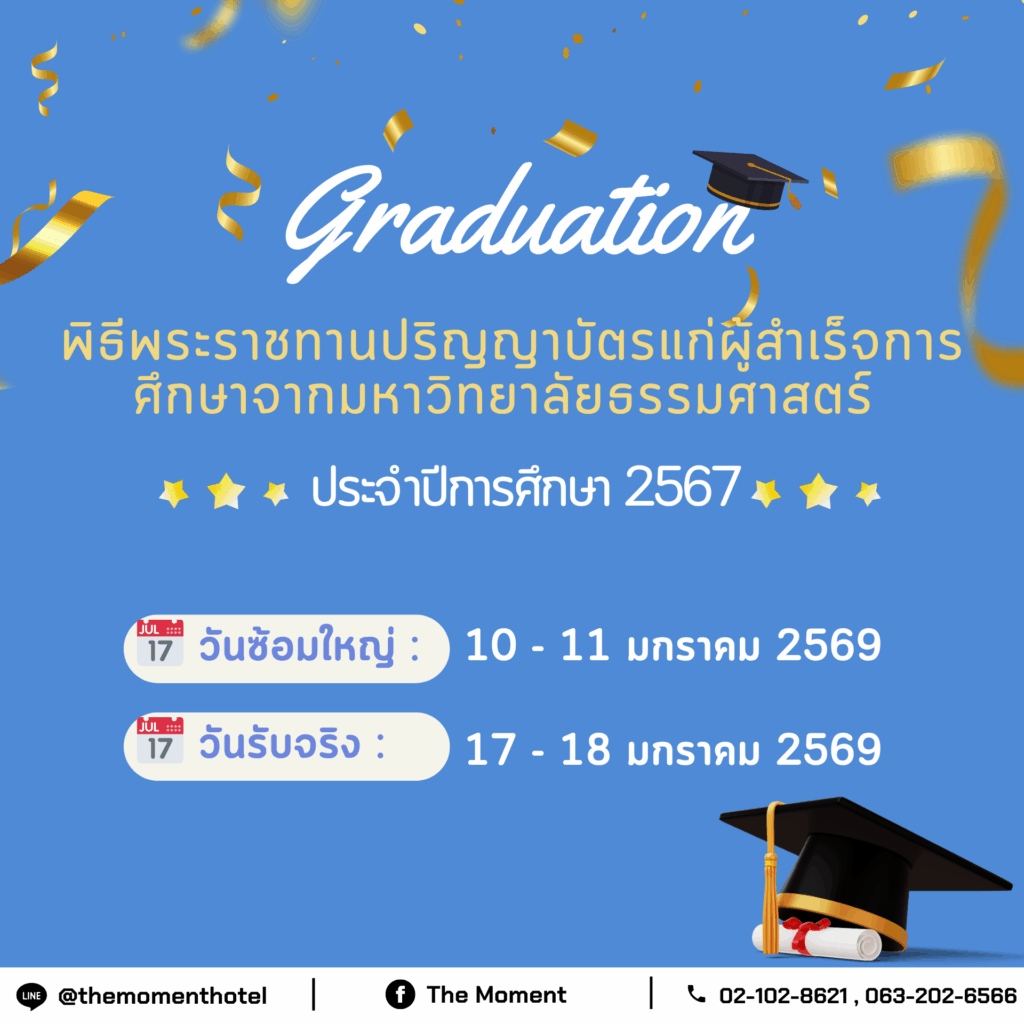 ขอแสดงความยินดีกับบัณฑิตใหม่จากมหาวิทยาลัยธรรมศาสตร์ทุกท่าน ที่กำลังจะเข้าร่วม พิธีพระราชทานปริญญาบัตร ประจำปีการศึกษา 2567 โดยงานจะจัดขึ้นที่ อาคารกิตติยาคาร ศูนย์รังสิต มหาวิทยาลัยธรรมศาสตร์ 📅 กำหนดการสำคัญ วันซ้อมใหญ่ : 10 – 11 มกราคม 2569 วันรับจริง : 17 – 18 มกราคม 2569 ⏰ บัณฑิตปริญญาตรีรับช่วงเวลา 17.00 น. 🎓 สำหรับผู้ปกครองและครอบครัว สามารถเข้าร่วมชมบัณฑิตมหาบัณฑิตและประกาศนียบัตรบัณฑิตได้ในวันอาทิตย์ที่ 18 มกราคม 2569 เวลา 09.00 น. . 🏨 ที่พักแนะนำใกล้มหาวิทยาลัยธรรมศาสตร์ รังสิต ที่พักใกล้มหาวิทยาลัยธรรมศาสตร์ ห้องพักใกล้งานรับปริญญาธรรมศาสตร์ รังสิต ห้องพักรายวันรังสิต The Moment เหมาะสำหรับบัณฑิตและครอบครัวที่กำลังมองหาที่พักใกล้มหาวิทยาลัยธรรมศาสตร์ ที่พักมอธรรมศาสตร์ ที่พักรายวันใกล้ธรรมศาสตร์ โรงแรมใกล้งานรับปริญญาธรรมศาสตร์รังสิต โรงแรมรังสิต เป็นทางเลือกที่ตอบโจทย์ทั้งความสะดวกและความคุ้มค่า เพราะที่พักตั้งในทำเลที่เดินทางสะดวก ใช้เวลาเดินทางเพียง 7 นาทีถึง มหาวิทยาลัยธรรมศาสตร์ รังสิต ห้องพักสะอาด สไตล์เรียบหรู สิ่งอำนวยความสะดวกครบครัน […]