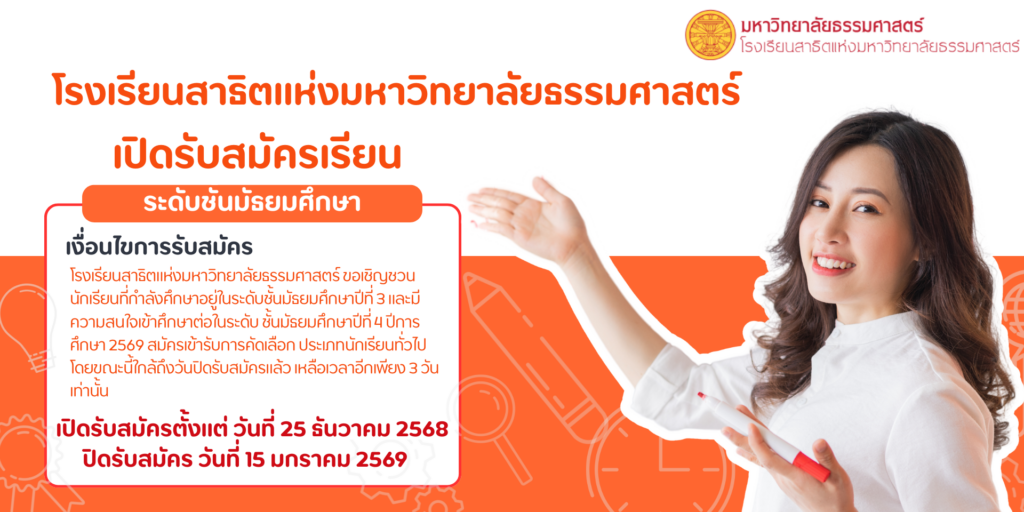 โรงเรียนสาธิตแห่งมหาวิทยาลัยธรรมศาสตร์ เปิดรับสมัครนักเรียนที่กำลังศึกษาอยู่ในระดับชั้นมัธยมศึกษาปีที่ 3 และมีความสนใจเข้าศึกษาต่อในระดับชั้นมัธยมศึกษาปีที่ 4 ปีการศึกษา 2569 เพื่อเข้ารับการคัดเลือกประเภทนักเรียนทั่วไป โดยขณะนี้ใกล้ถึงวันปิดรับสมัครแล้ว เหลือเวลาอีกเพียง 3 วันเท่านั้น