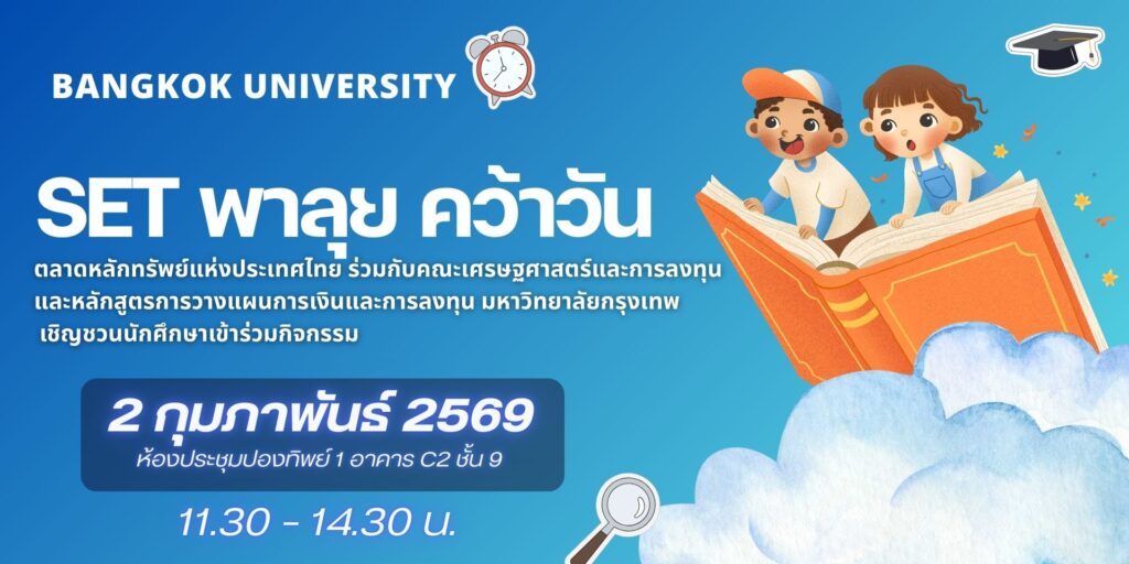 ร่วมกับคณะเศรษฐศาสตร์และการลงทุน และหลักสูตร การวางแผนการเงินและการลงทุน มหาวิทยาลัยกรุงเทพ เชิญชวนนักศึกษาเข้าร่วมกิจกรรม