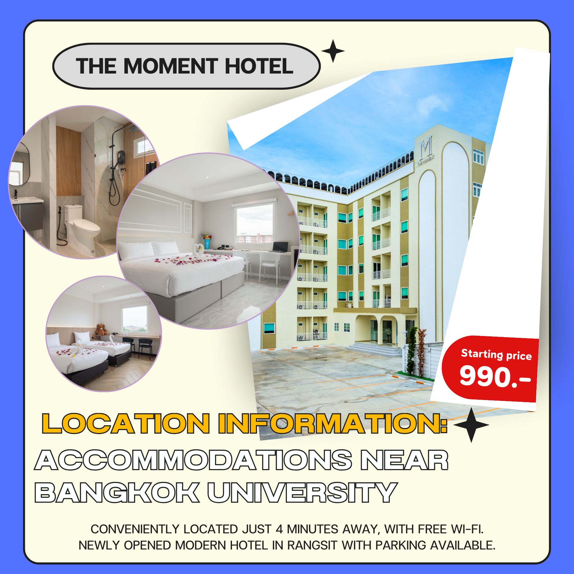 Are you looking for convenient accommodation near Bangkok University and Thammasat University, Rangsit? The Moment Hotel is the perfect choice for you. This newly opened hotel offers a complete stay experience with comfort, privacy, and a serene atmosphere. It is ideal for students, business visitors, or anyone who wants to relax before or after attending important activities in the Rangsit area.