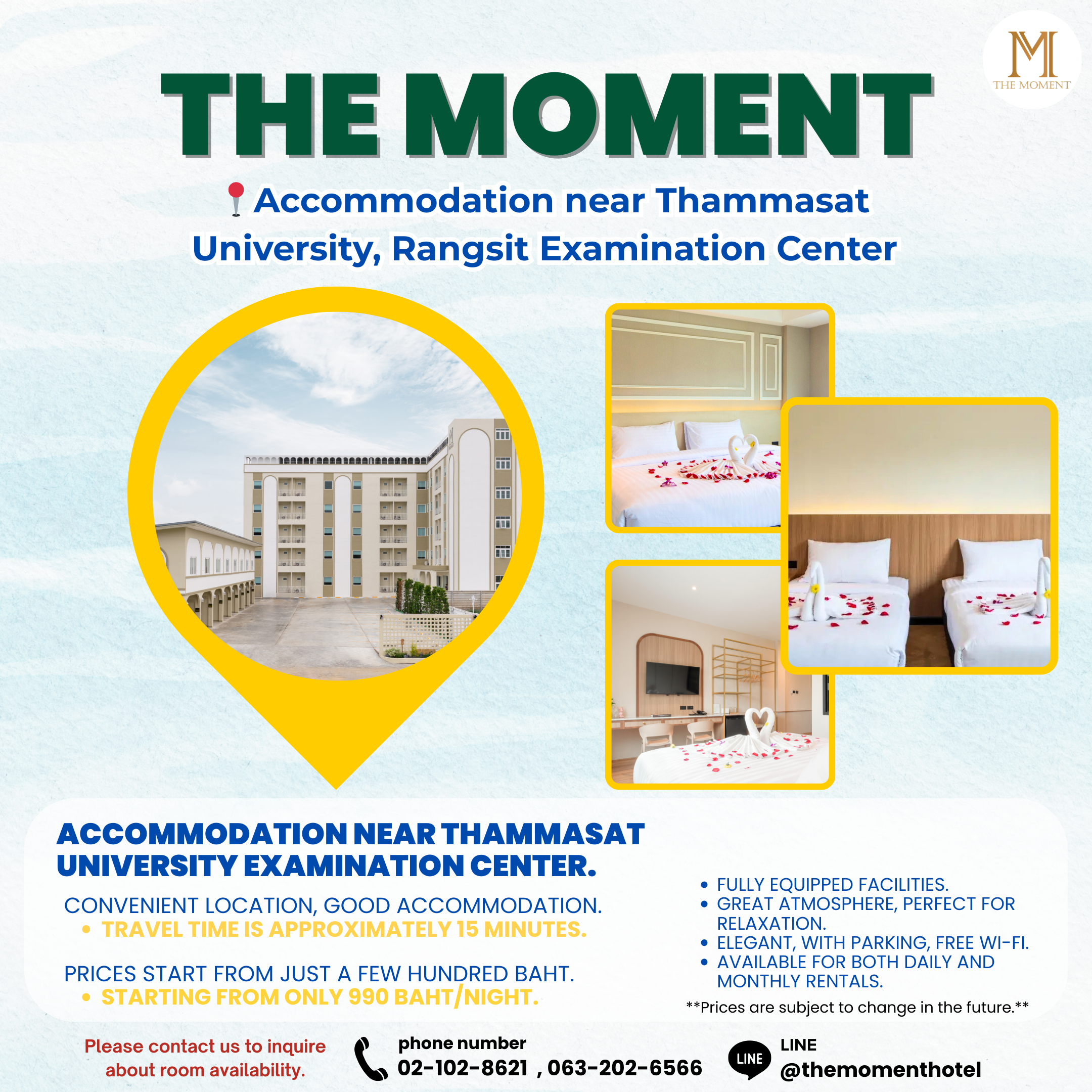 If you are looking for...of accommodation near Thammasat University Rangsit Examination Center Daily room rentals near Thammasat University, accommodation near Thammasat University, Rangsit Hotel The Moment  Daily hotel rentals near Thammasat University Rangsit Examination Center, Thammasat University Rangsit Hotel, accommodation in the Rangsit area  This is another great option to help you get ready and confident for your exam. The accommodation is close to the exam center, offering convenient transportation, clean and quiet rooms perfect for resting before your exam. It has complete amenities, parking, and Wi-Fi. Prices start from... 990 THB/night 💰