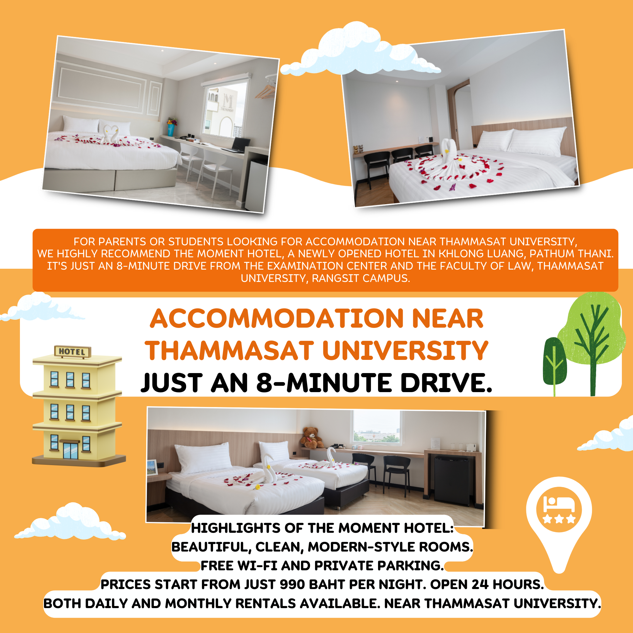 If you're looking for accommodation near Bangkok University, Rangsit Campus, daily rooms near Bangkok University, daily rentals near Bangkok University, or hotels near Bangkok University that are new, clean, in a great location, and conveniently accessible, we recommend The Moment. Quality accommodation, budget-friendly Rangsit accommodation (under 1000 baht), daily rentals, cheap Rangsit rooms, and daily hotel rentals in Rangsit are perfect for students, working professionals, and travelers. 🧳✨ The Moment is located in a convenient location.