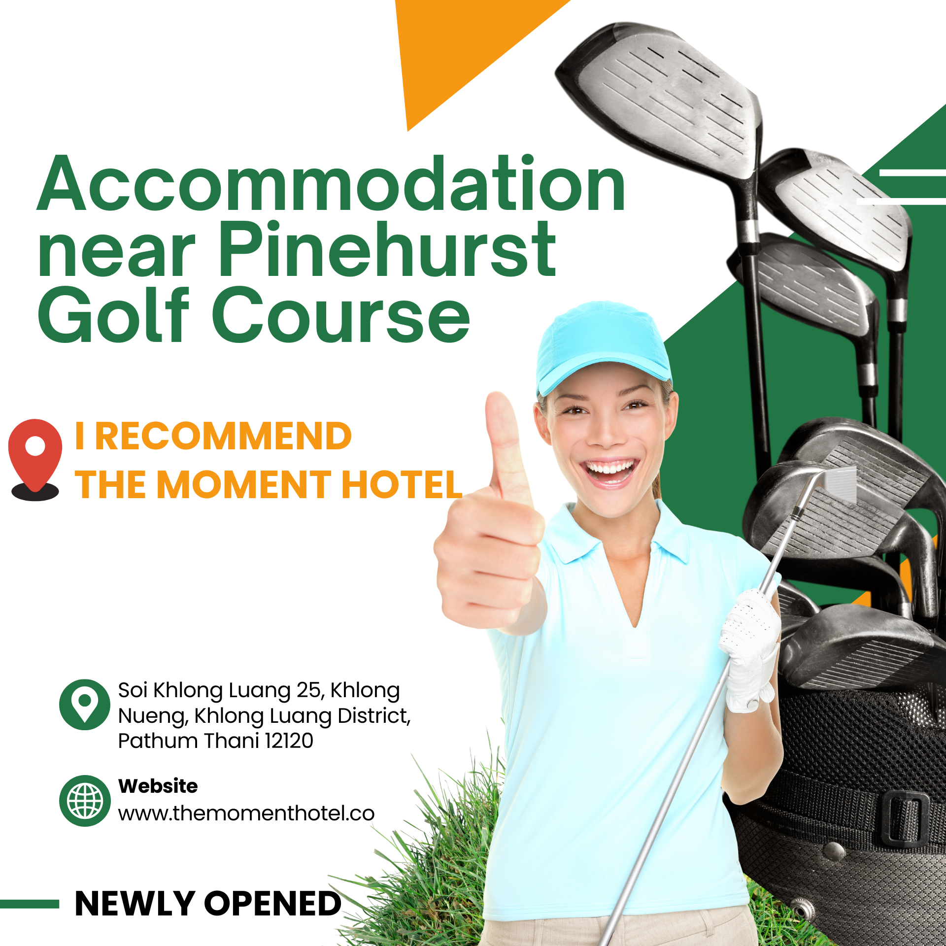 For golfers, athletes, or those who have competitions and activities at Pinehurst Golf & Country Club, if you are looking for a hotel that is nearby, easy to travel to, and can relax to the fullest, The Moment Hotel, accommodation near Pinehurst Golf Course, daily rooms near Pinehurst Golf Course, hotels near Pinehurst Golf Course are the most suitable accommodation in the Khlong Luang - Rangsit area, with a location that allows you to travel from the hotel to Pinehurst Golf Course in less than 10 minutes.