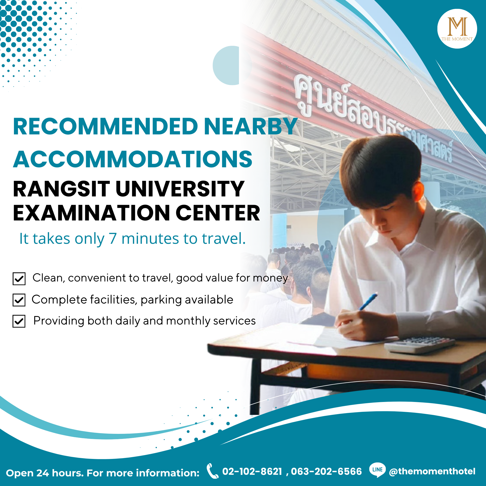 If you are looking for a "hotel near Thammasat Rangsit" or "hotel near Thammasat Rangsit examination center" that is easy to travel to, convenient and provides good value, The Moment daily hotel Rangsit, hotel near Thammasat examination center is one of the options that perfectly meets the needs, whether it is for those who come to take the exam, run errands, participate in university activities or parents who want accommodation near their children. The Moment daily accommodation near the examination center, daily accommodation Rangsit is located in a location where you can travel to Thammasat Rangsit examination center within only about 7 minutes.