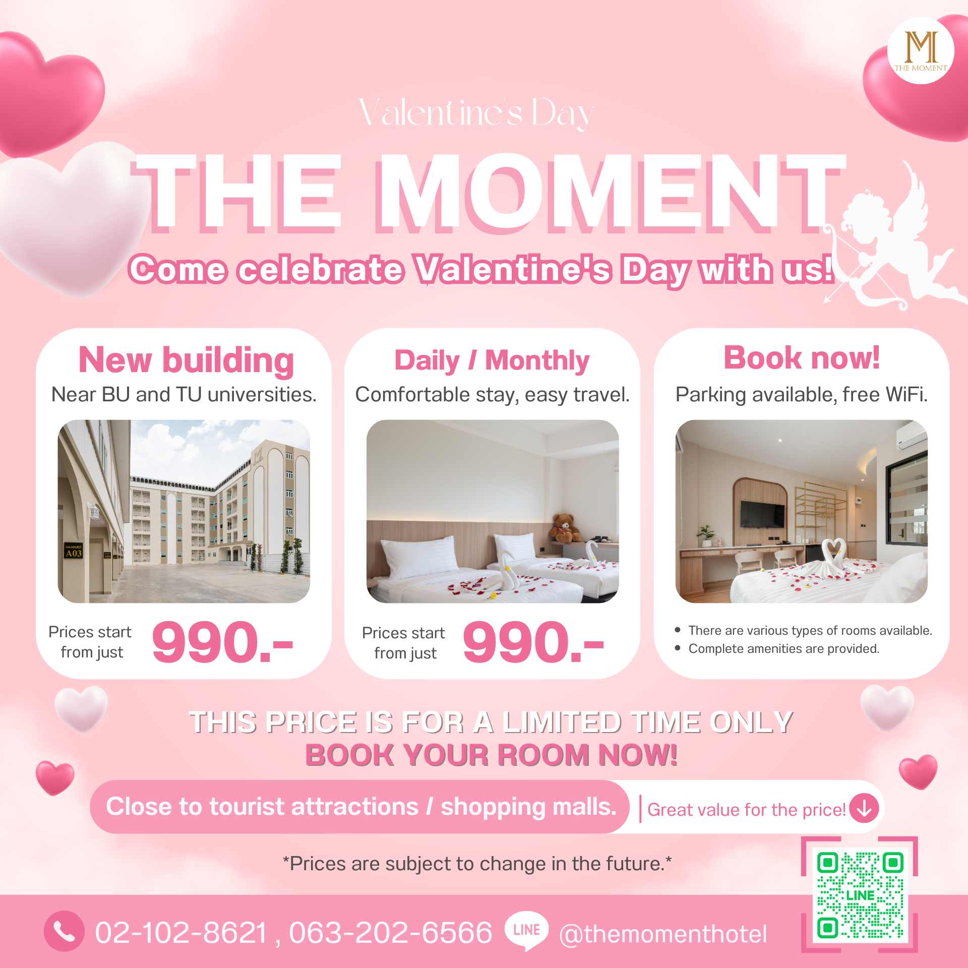 This Valentine's Day, if you're looking for a place to stay with a great atmosphere and convenient location near Bangkok University (BU) and Thammasat University, Rangsit Campus (TU), we recommend The Moment Hotel. This daily rental hotel near Bangkok University, offers rooms close to BU and Thammasat University, Rangsit Campus, ready to make every special moment perfect ✨ New, beautifully decorated, clean, and spacious rooms ✨ Available for both daily and monthly rentals. Enjoy a comfortable stay!