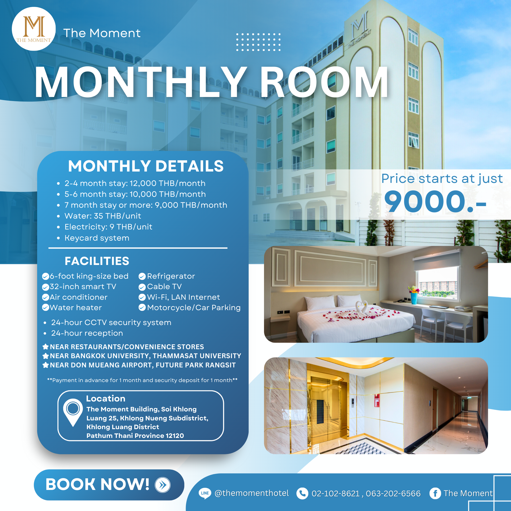 🏨 Great Value Monthly Stay at The Moment – Comfortable, Convenient, and Fully Equipped! If you are looking for a monthly room that is comfortable, well-located, and close to the university, The Moment is the perfect choice! Whether you need a monthly room near Bangkok University Rangsit, long-term stay near BU Rangsit, monthly accommodation near Thammasat University Rangsit, or a dormitory-style stay near TU Rangsit, The Moment has everything you need. With budget-friendly monthly rates starting from 9,000 THB, The Moment is ideal for anyone searching for a monthly room in Rangsit, long-term accommodation in Rangsit, or a monthly hotel in Khlong Luang, complete with full facilities. Perfect for students, working professionals, or anyone looking for a long-term stay in the Khlong Luang – Pathum Thani area.