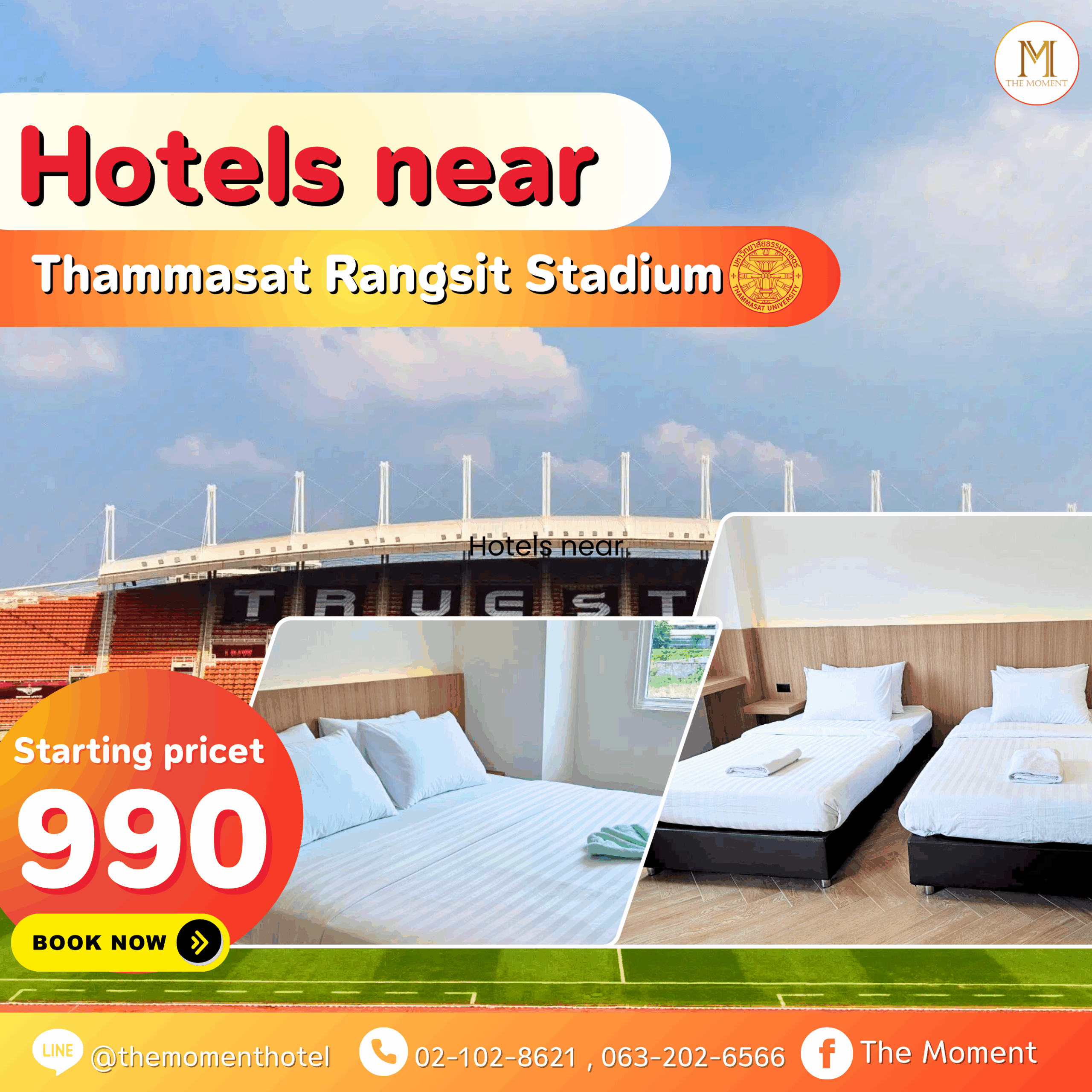 Looking for accommodation near Thammasat Rangsit Stadium? We recommend The Moment Hotel, a daily room rental near Thammasat Rangsit Stadium. It's the perfect answer for those looking for convenient, easy-to-travel accommodation. It's just a few minutes from Thammasat Rangsit Stadium, perfect for those who come to cheer on sports, compete, train, take exams, or participate in various activities within the university. Here, we offer spacious, clean rooms with soft, comfortable beds, accommodating both single and group occupants, at affordable prices, starting at just 990 baht per night.