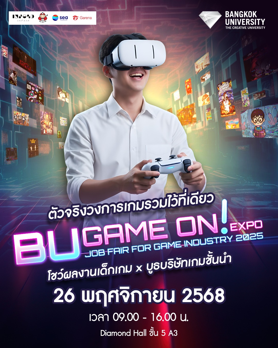 🎮 BU Game On! Expo 2025 x Mini Job Fair — The ultimate event for showcasing your work and finding gaming career opportunities! Get ready for the annual highlight for gaming enthusiasts! On November 26, the Faculty of Information Technology and Innovation at Bangkok University opens its space for game developers, students, and gaming fans to showcase their projects, meet leading game companies, and level up their skills with industry experts throughout the day. 🔥