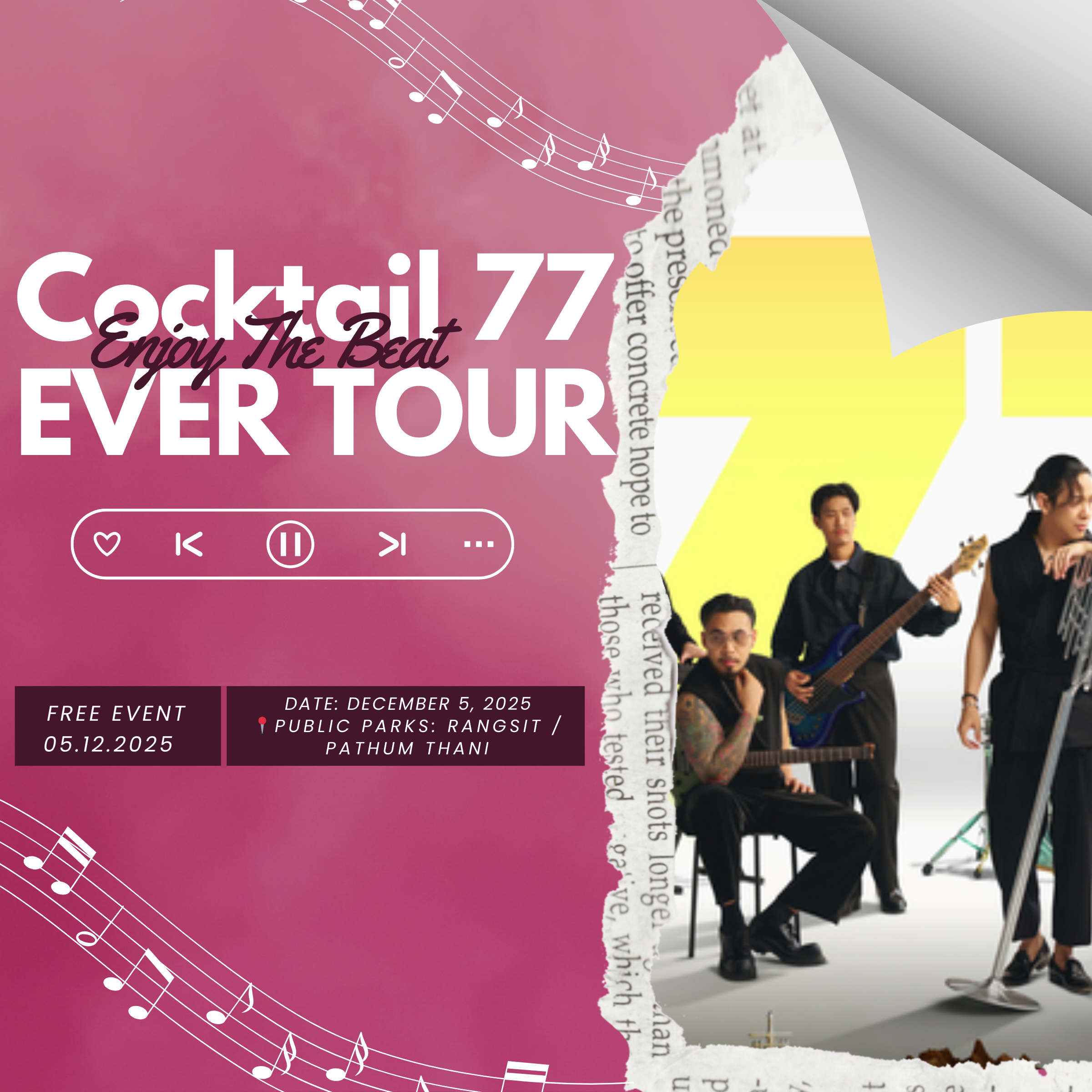 Cocktail 77 Ever Tour – Enjoy the Beat and Experience the Ultimate Rock Energy! Get ready for an unforgettable night at the “Cocktail 77 Ever Tour – Enjoy The Beat”, a special concert that brings explosive energy, powerful performances, and an immersive music experience from one of Thailand’s top rock bands — Cocktail. This event is designed especially for fans who want to enjoy the band’s iconic songs in an electrifying and intimate atmosphere.