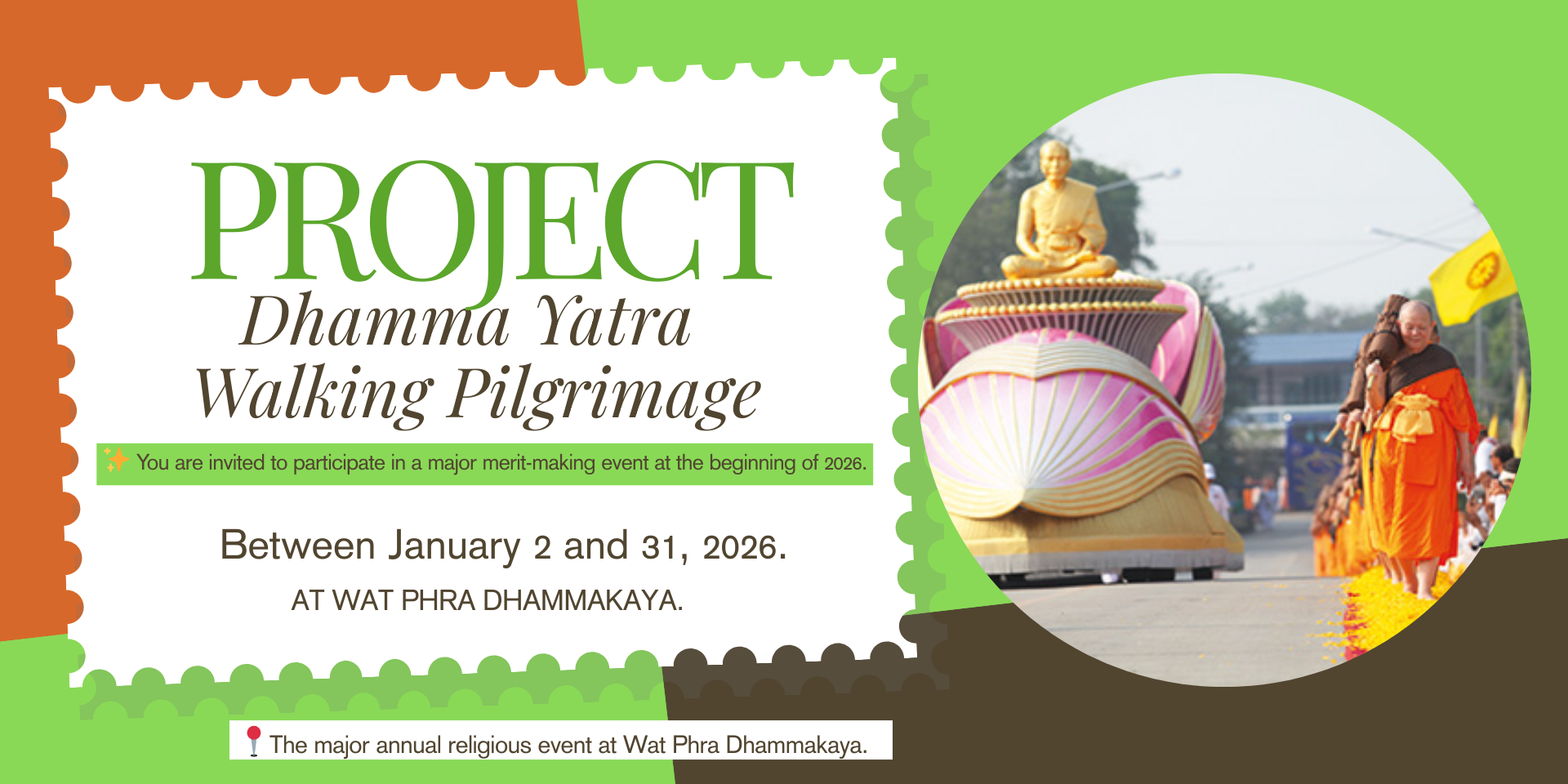 The Dhammayatra Pilgrimage Walk Project is an important Buddhist activity held annually in January. In 2026, the event is scheduled to take place from January 2–31, 2026, in the Khlong Luang District, Pathum Thani Province, with Wat Phra Dhammakaya serving as the central venue. This project is organized to pay tribute in gratitude to the Most Venerable Phramongkolthepmuni (Sot Chandasaro), to help preserve and propagate Buddhism, and to encourage Buddhists to begin the New Year by making merit together in unity.