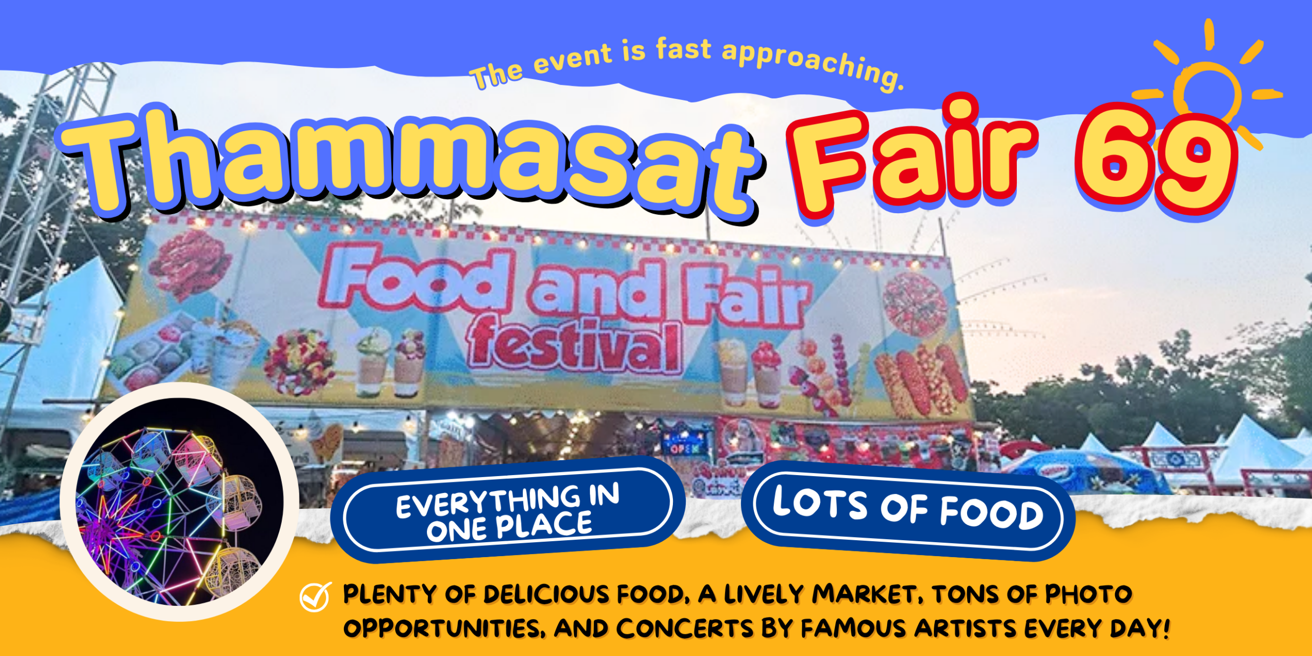 🔥 The biggest event of the year! Don't miss THAMMASAT FAIR 2026 (3rd Thammasat Fair) ✨🚩 The highly anticipated fair is back! It brings together all the fun in one place, including delicious food 🍢🍧, entertaining zones 🎡, photo-worthy spots 📸, and the highlight: concerts by famous artists 🎤🎶. Enjoy a lively atmosphere all day long – shop, sample delicious food, and listen to music. Suitable for all ages!