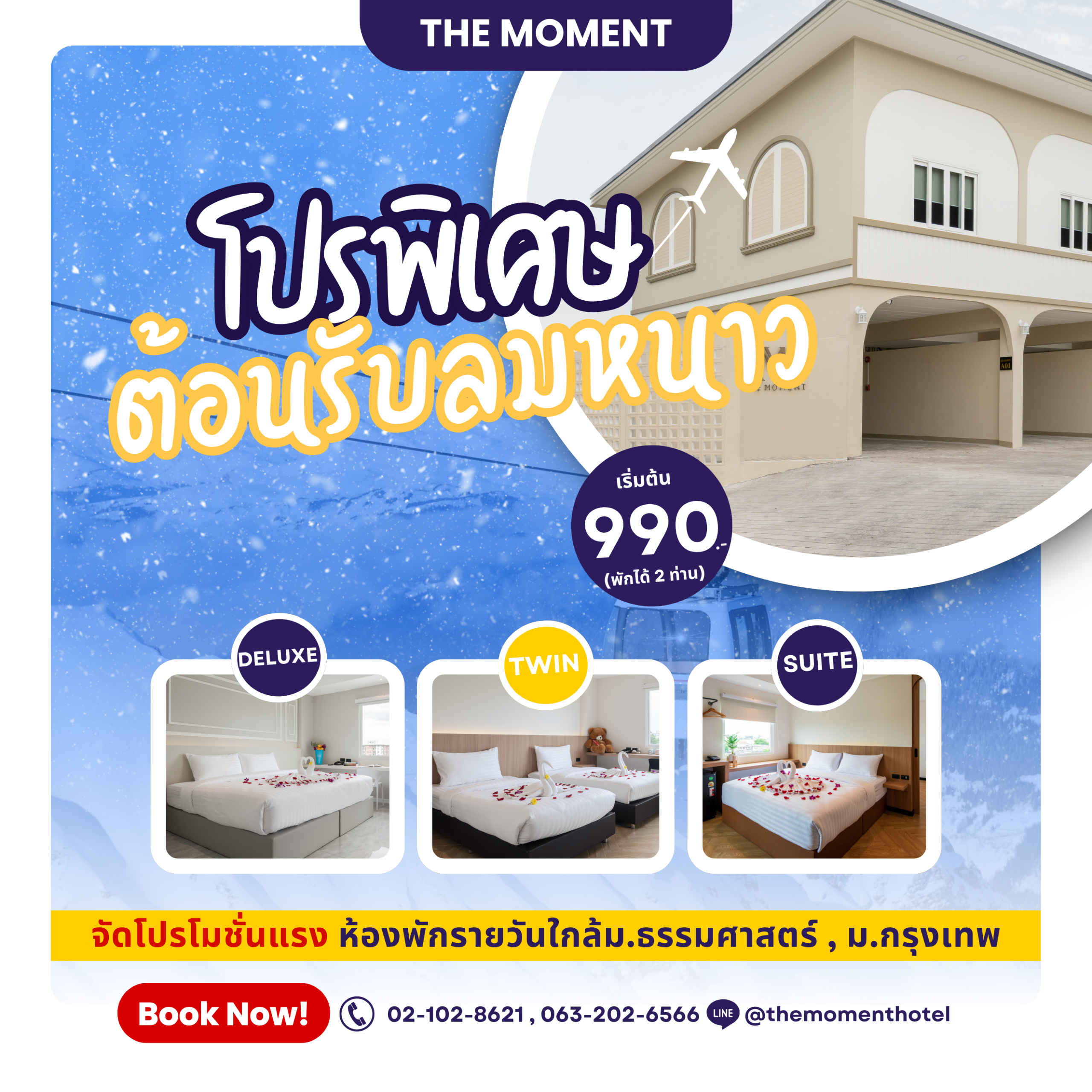 🌟 The Moment – A beautiful, clean hotel with a warm atmosphere and a fantastic location near Thammasat University, Rangsit Campus, Bangkok University, Rangsit Campus, and the Bangkok-Rangsit area. We're offering a special winter promotion ❄️ to make your stay even more comfortable and worthwhile! 💛 Room rates start from just 990 THB (for 2 people!).