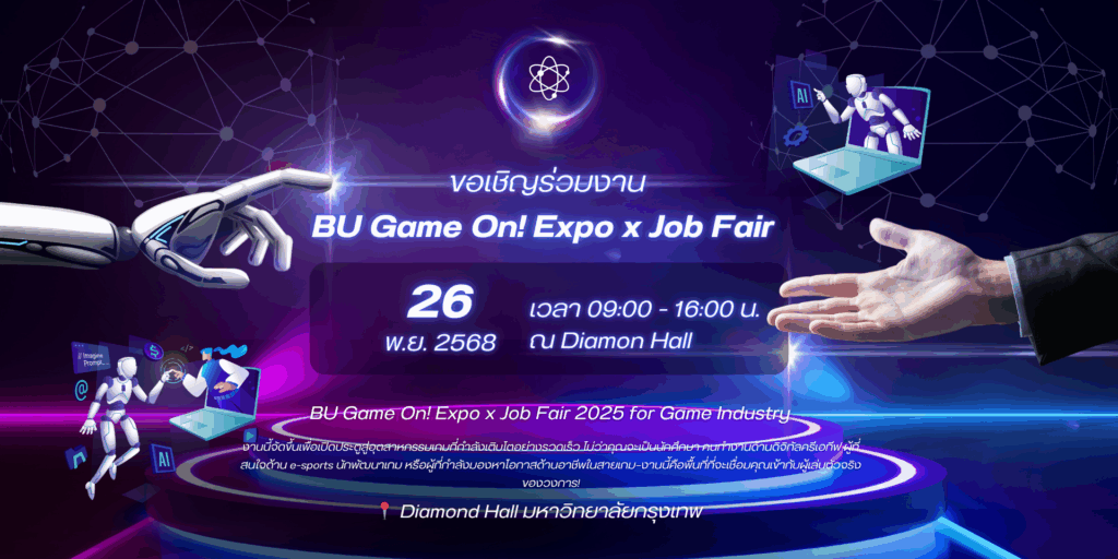 เชิญร่วมงาน BU Game On! Expo x Job Fair 2025 วันที่ 26 พฤศจิกายน 2568 เวลา 09.00–16.00 น. ณ Diamond Hall มหาวิทยาลัยกรุงเทพ งานที่จะพาคุณเข้าสู่วงการเกมอย่างเต็มตัว ทั้งโอกาสอาชีพและกิจกรรมสุดมันส์ ไฮไลต์ภายในงาน บูธ Ecosystem ชั้นนำ เช่น Infold Games, เถ้าแก่น้อย กิจกรรมแจกของรางวัลจาก Garena Thailand (Free Fire, ROV ฯลฯ) เจอผู้ประกอบการจริง พร้อมสมัครงานและฝึกงานในอุตสาหกรรมเกม อย่าลืม! วัน–เวลา–สถานที่ 📅 26 พฤศจิกายน 2568⏰ 09:00 – 16:00 น.📍 Diamond Hall มหาวิทยาลัยกรุงเทพ เหมาะสำหรับ นักศึกษา คนหางาน […]