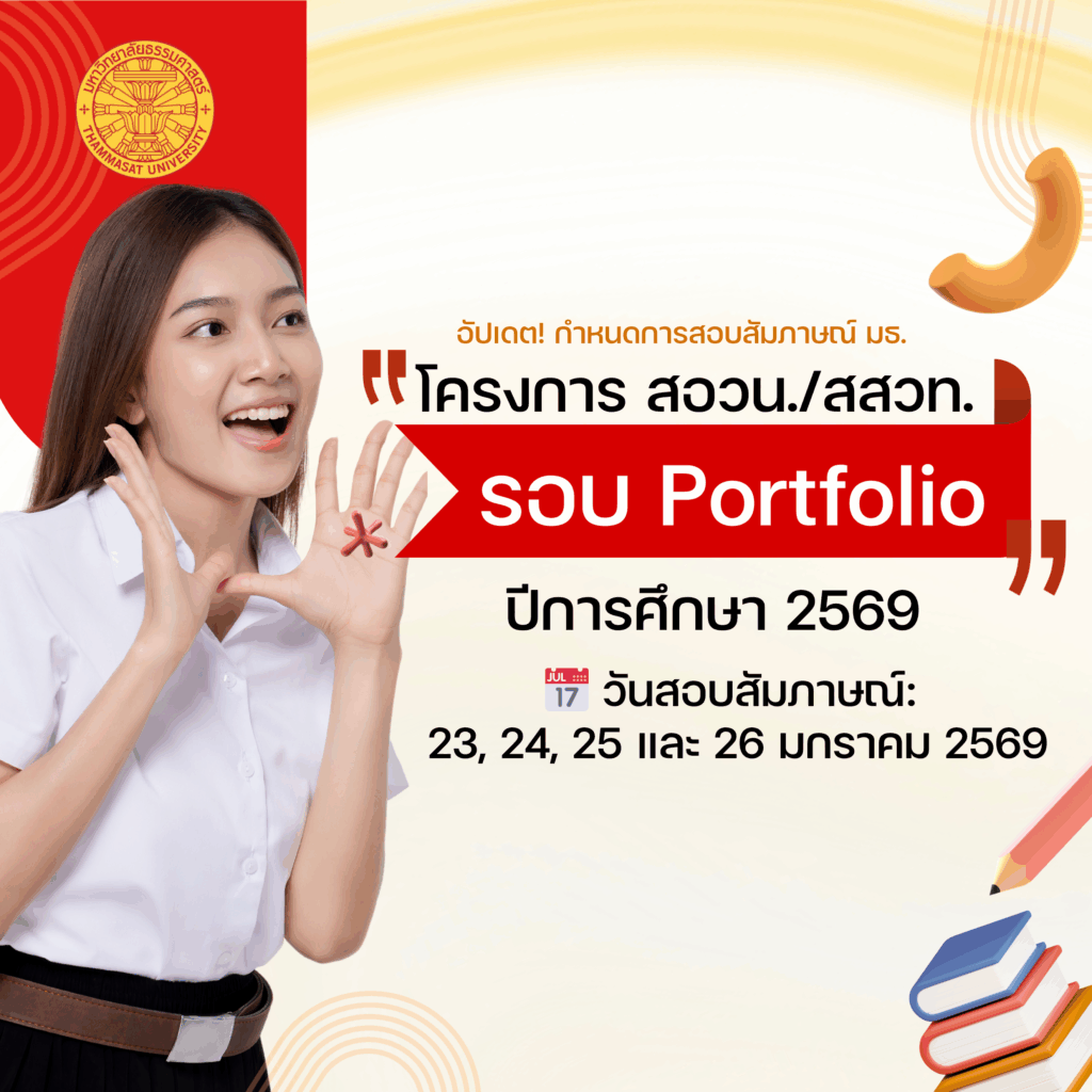 📣 มธ. อัปเดตกำหนดการสอบสัมภาษณ์ โครงการ สอวน. / สสวท. รอบ Portfolio ปีการศึกษา 2569 มหาวิทยาลัยธรรมศาสตร์ ได้ประกาศอัปเดตตารางสอบสัมภาษณ์สำหรับผู้สมัครใน โครงการ สอวน. (โอลิมปิกวิชาการ) และ โครงการ สสวท. รอบ Portfolio ประจำปีการศึกษา 2569 โดยกำหนดให้มีการสอบสัมภาษณ์ในช่วงเดือนมกราคม 2569 เพื่อคัดเลือกนักเรียนที่มีศักยภาพและผลงานโดดเด่นเข้าสู่รั้วมหาวิทยาลัยธรรมศาสตร์ 🗓️ กำหนดวันสอบสัมภาษณ์ ผู้สมัครที่ผ่านการคัดเลือกเข้าสู่รอบ Portfolio จะต้องเข้าร่วมการสอบสัมภาษณ์ในวันที่: 23 มกราคม 2569 24 มกราคม 2569 25 มกราคม 2569 26 มกราคม 2569 โดยผู้สมัครแต่ละคนจะต้องตรวจสอบวันและเวลาของตนเองผ่านระบบประกาศของคณะ/สำนักที่เกี่ยวข้อง เพื่อเตรียมตัวให้พร้อมก่อนถึงวันสอบจริง 🎯 ความสำคัญของรอบ Portfolio รอบ Portfolio เป็นหนึ่งในรอบการคัดเลือกที่ให้ความสำคัญกับ ศักยภาพ ผลงาน และความถนัดของผู้สมัคร มากกว่าการสอบข้อเขียน […]