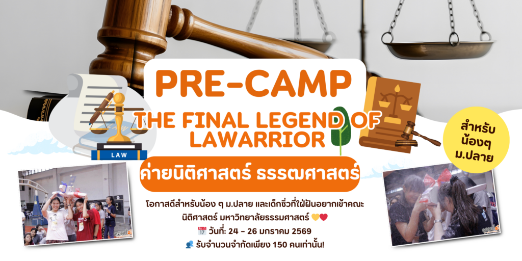 PRE-CAMP : THE FINAL LEGEND OF LAWARRIOR คือค่ายเตรียมความพร้อมสุดเข้มข้นสำหรับน้อง ๆ ระดับมัธยมศึกษาตอนปลาย และเยาวชนที่มีความฝันอยากก้าวเข้าสู่โลกของ นิติศาสตร์และรัฐศาสตร์ 🧠📚 ค่ายนี้ถูกออกแบบมาเพื่อพาน้อง ๆ ไปสัมผัสประสบการณ์จริงของนักกฎหมาย ผ่านกิจกรรมหลากหลายรูปแบบ ทั้งการเรียนรู้เชิงปฏิบัติ เวิร์กช็อปจากรุ่นพี่คณะนิติศาสตร์ และกิจกรรมจำลองศาล (MOOT COURT) ที่ให้น้อง ๆ ได้ลองสวมบทบาททั้งทนายความและผู้พิพากษา ⚖️✨ ตลอดระยะเวลา 3 วัน 2 คืน ผู้เข้าร่วมจะได้ฝึกกระบวนการคิดอย่างเป็นระบบ การใช้เหตุผลเชิงกฎหมาย และการทำงานเป็นทีม พร้อมเติมเต็มแรงบันดาลใจในการเลือกเส้นทางการศึกษาในอนาคต 💡🤝 📅 จัดขึ้นระหว่างวันที่ 24 – 26 มกราคม 2569 👥 รับจำนวนจำกัดเพียง 150 คนเท่านั้น สถานที่ : มหาวิทยาลัยธรรมศาสตร์ ศูนย์รังสิต หากคุณคือหนึ่งในผู้ที่ใฝ่ฝันอยากเป็น “นักกฎหมาย” นี่คือโอกาสสำคัญในการเริ่มต้นตำนานบทแรกของคุณ ก่อนที่ตำนานบทสุดท้ายของค่ายนี้จะปิดฉากลงอย่างสมบูรณ์ […]