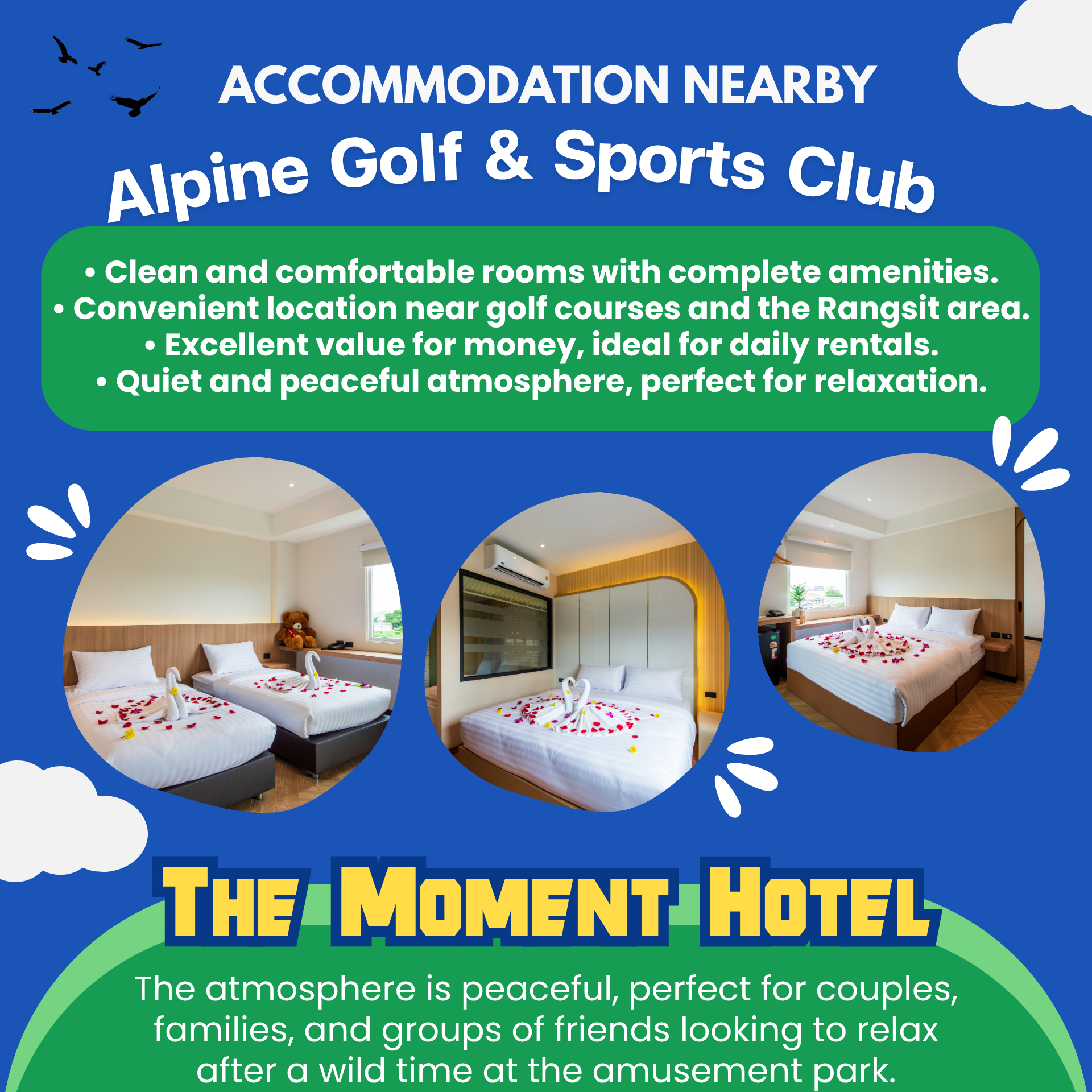 Hotel The Moment, a daily rental hotel in Pathum Thani, a budget hotel in Khlong Luang It's a suitable option for those who need it Lodging near Find accommodation near Alpine Golf & Sports Club With its easily accessible distance, it's ideal for relaxing after a round of golf or for a stopover during a trip