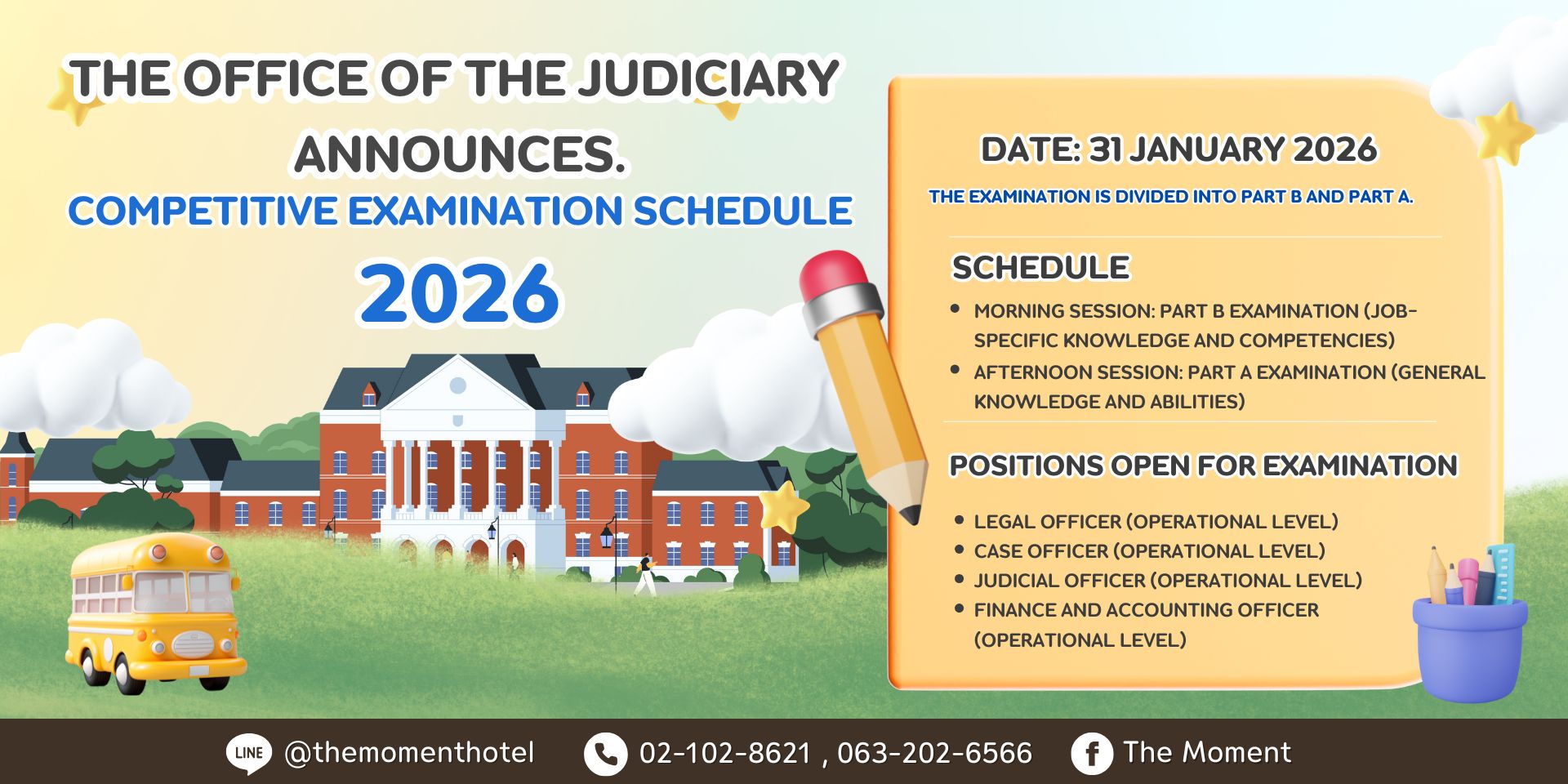 The Office of the Judiciary has scheduled a competitive examination for the recruitment and appointment of individuals to civil service positions for the year B.E. 2569 (2026), with the objective of selecting qualified candidates who possess the knowledge, abilities, and appropriate qualifications to perform duties within the judicial process, which is a vital mission of the nation.